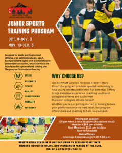 Led by NASM Certified Personal Trainer Tiffany Elmer, this program provides specialized training to help young athletes reach their full potential. Tiffany brings extensive experience coaching youth and collegiate athletes and is a former Division I collegiate athlete herself.